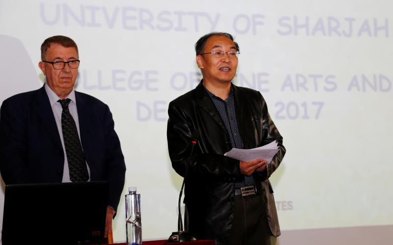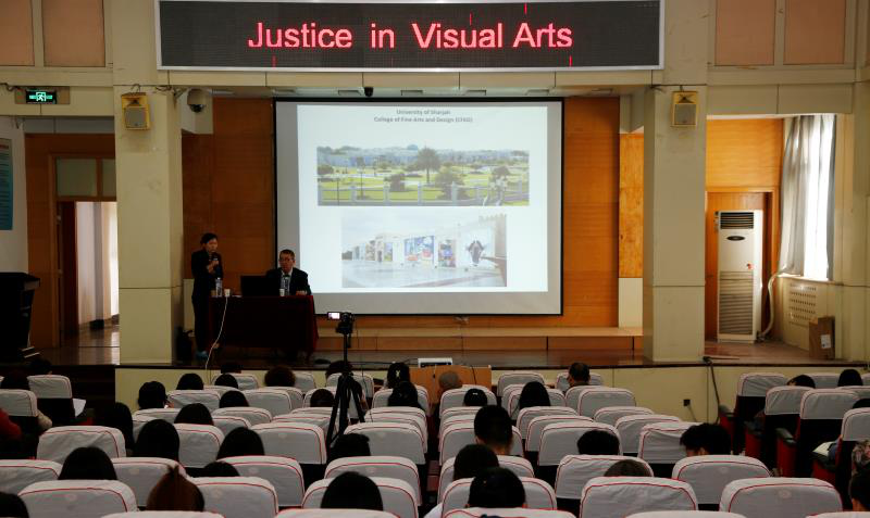 齐全的教学设施,包括工作室、实验室等,可以充分满足同学们制作作品的需求。沙迦大学每年都会举办课业展、学生作品展示、毕业设计展等大型活动,让每个同学都能在活动中体现自己的价值,每次活动都会邀请阿联酋的国王以及全国名士参加。随后,Platon Alexiou教授就“公正在视觉艺术中的运用”进行详细的讲解:从象征正义的女神像、雕塑、行为艺术、书籍、货币、漫画、招贴等很多不同的形式中解释了“正义”是怎样进入我们的视线,是怎样在不同视觉艺术中进行体现。最后,柏拉图教授介绍了当下对于家具的研究成果,师生们耳目一新,直观了解了当地的家具设计风格。