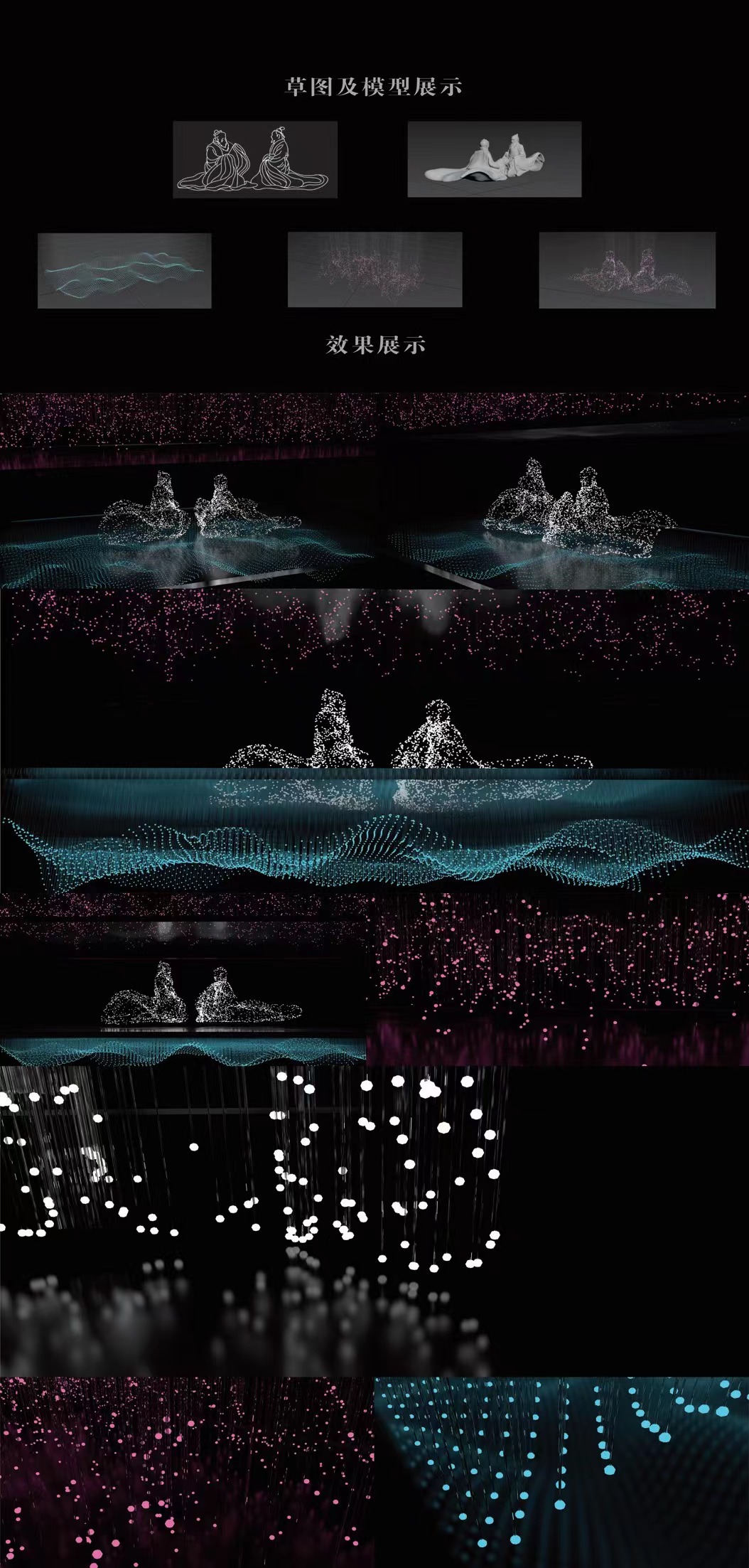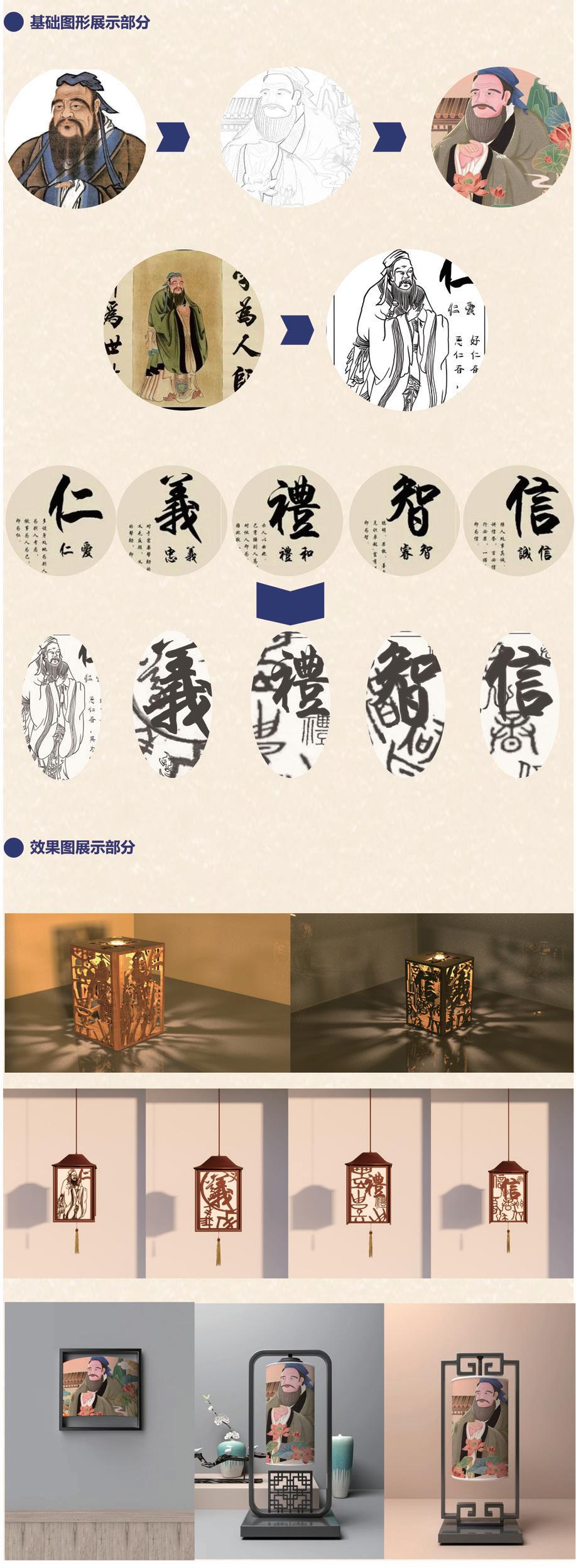 基于“孔子见老子”文化基础条件下,用视觉语言去呈现孔子见老子所体现的思想统合与文化的交融,通过矩阵的方式为“孔子见老子”这一事件呈现引人深思的为公共空间所添彩的灯光艺术装置。“孔子见老子”灯光装置分为三个部分,第一部分是“上善若水”的精髓,通过光纤维呈现出抽象水的形态体现善行像水一样滋润万物。第二部分是仁义,通过光纤维矩阵具象的孔子与老子形象表达仁义。第三部分是天道,通过光点矩阵垂落的错落有致,来抽象地表现天道,运用宇宙的视觉形象,从光源的颜色变化,体现天道的浩渺渊深似海。