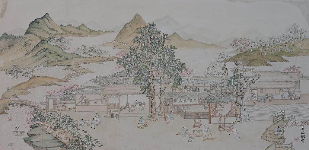 The composition of this work goes with a scatter perspective, which is one of the typical features of Chinese landscape paintings. From looking up and down, far and close, the work shows a realm of "thousands of miles at a distance". It can be divided into three parts. The first part is a close shot, which is also the part with the most brush strokes. It mainly describes people's daily life. The second part is the nearby mountains with blue-green colors, and the third part isthe distant mountains with light ink, which makes the whole work more spatial.