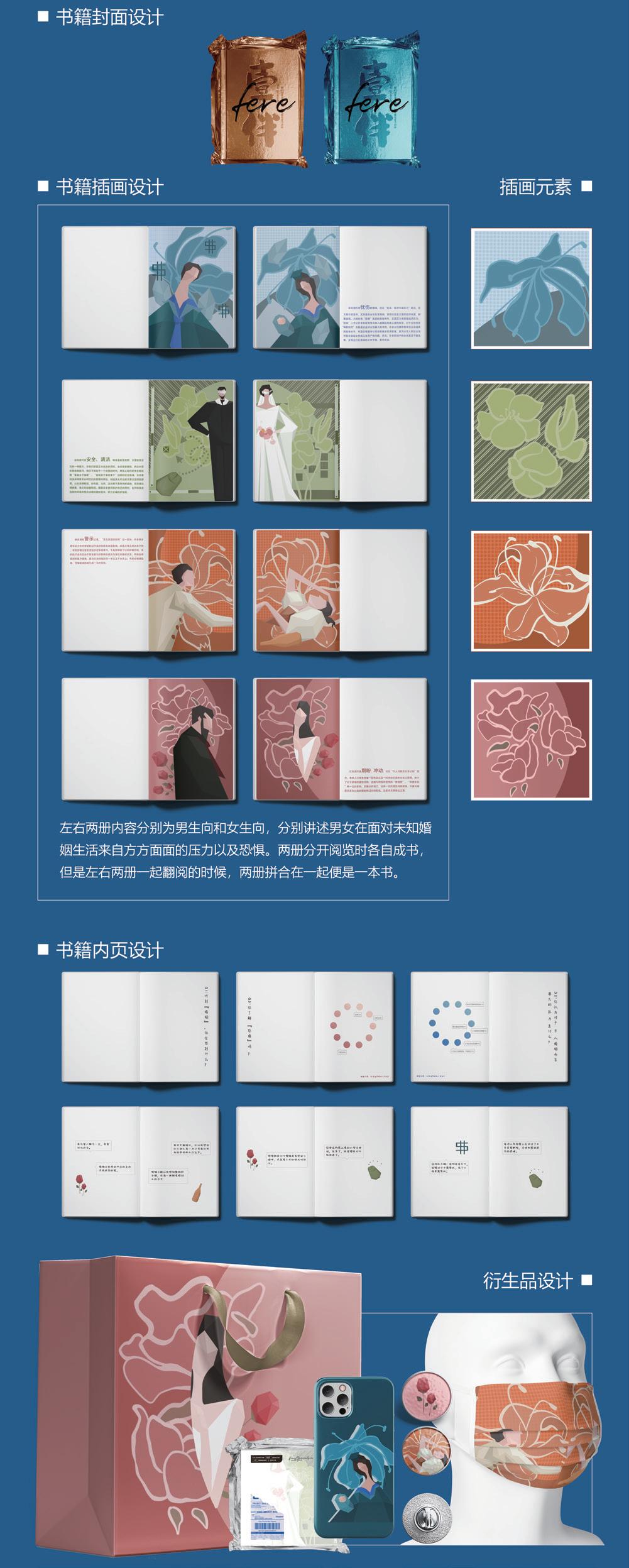 The left and right volumes of the book are male and female directions respectively. The male direction opens and closes on the right side of the book, while the female direction opens and closes on the left side. They respectively tell the story of men and women facing the pressure and fear from all aspects of the unknown marriage life. When the two books are read separately, they become separate books, but when the left and right books are read together, they become one book. When the two volumes are read alone, the boy and the girl in the illustration are facing all their troubles alone. However, when the two volumes are put together, a beautiful and harmonious picture emerges, in which the boy and the girl supportand depend on each other.