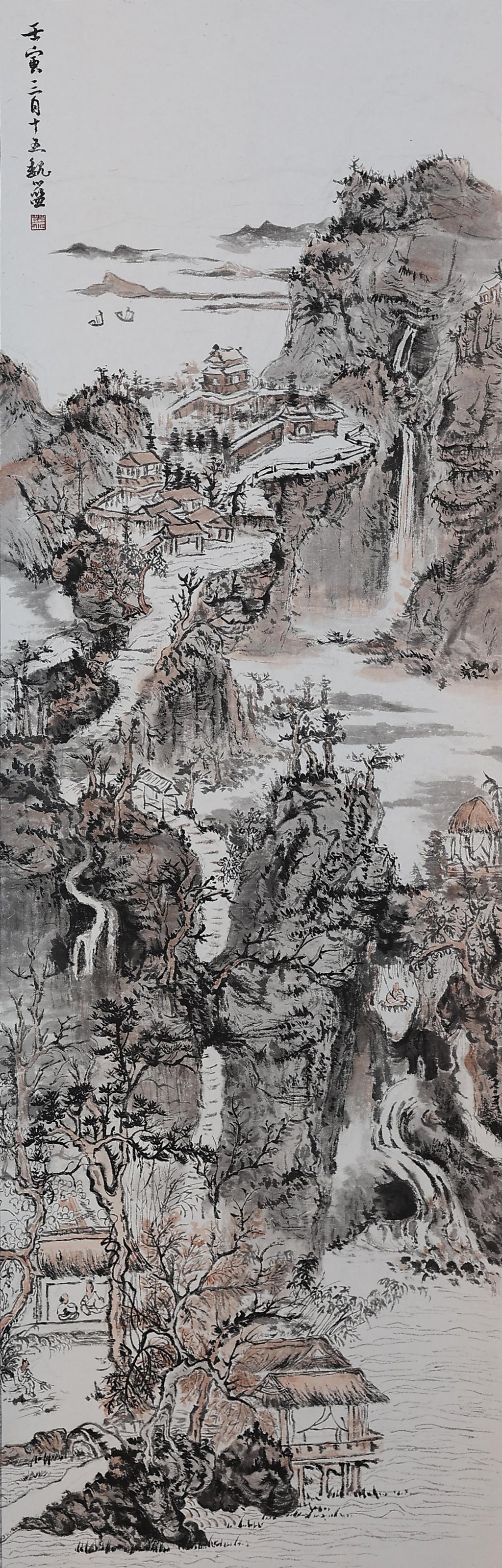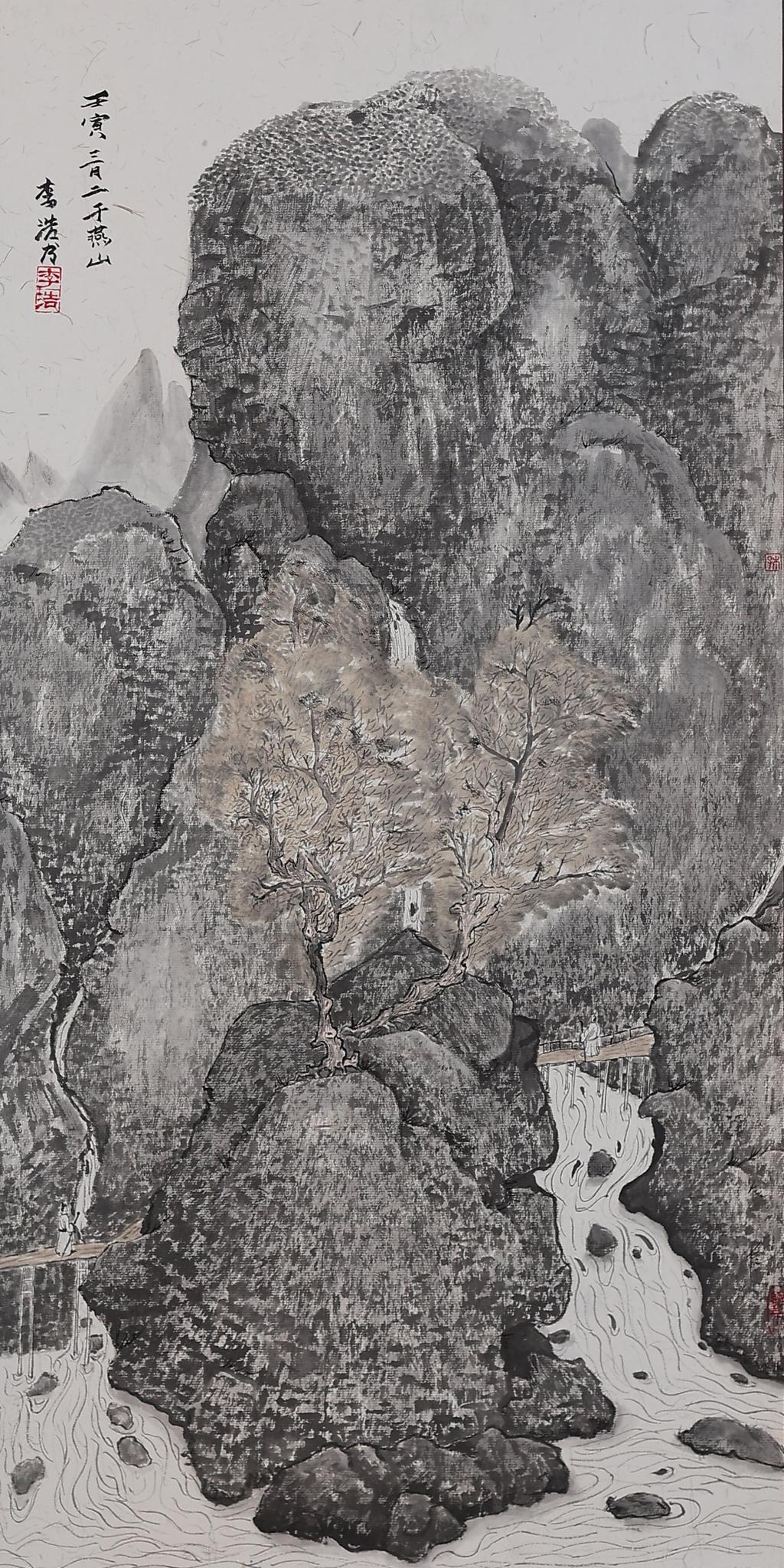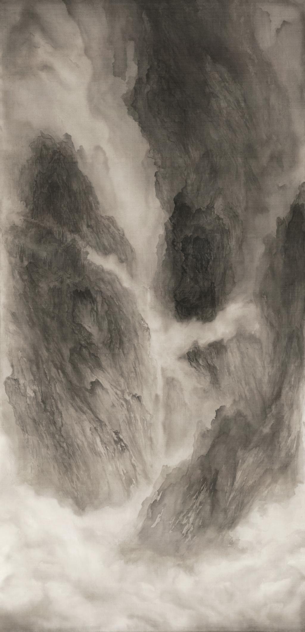 创作说明该作品营造的 “境”在虚实之间。随着时间流逝,中国山水画的理念、传承、技法以及评价体系不断推陈出新,“境”也被历史赋予了“境界”、“心境” 等新的含义。作者意在通过对画面虚实关系的处理来表达自身对山水意境的体会。与纸本不同,绢本在材质上更透、更细腻,更易于表现水墨的流动特性,在表现云、水、雾气的涌动与澎湃方面有独到的优势。这张作品利用绢本的特质,通过笔墨的虛、实变幻营造了一种理想之境。