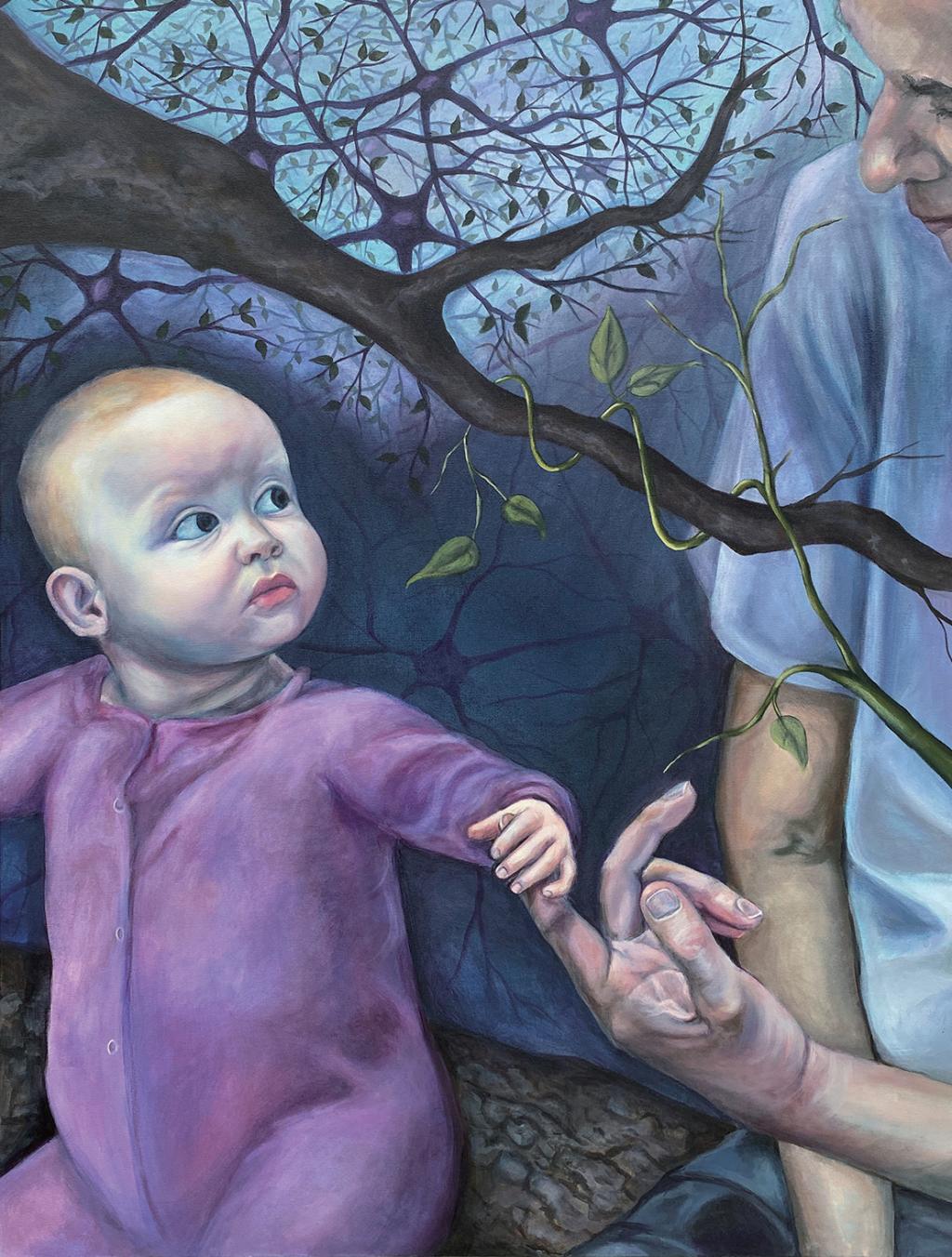 My work explores concepts of life cycles, growth and development, and stability versus mutability, which can be applied to the universals of the human experience. I find it useful to express these themes in juxtaposition with basic, even mundane elements of the natural world in order to highlight their pervasiveness in our lives. By portraying human and natural forms morphing together as they exist parallel to one another, a transfiguration occurs wherein they can be understood as one and the same. This piece explores the development of organisms and highlights the systems of the brain that allow us to move through life.