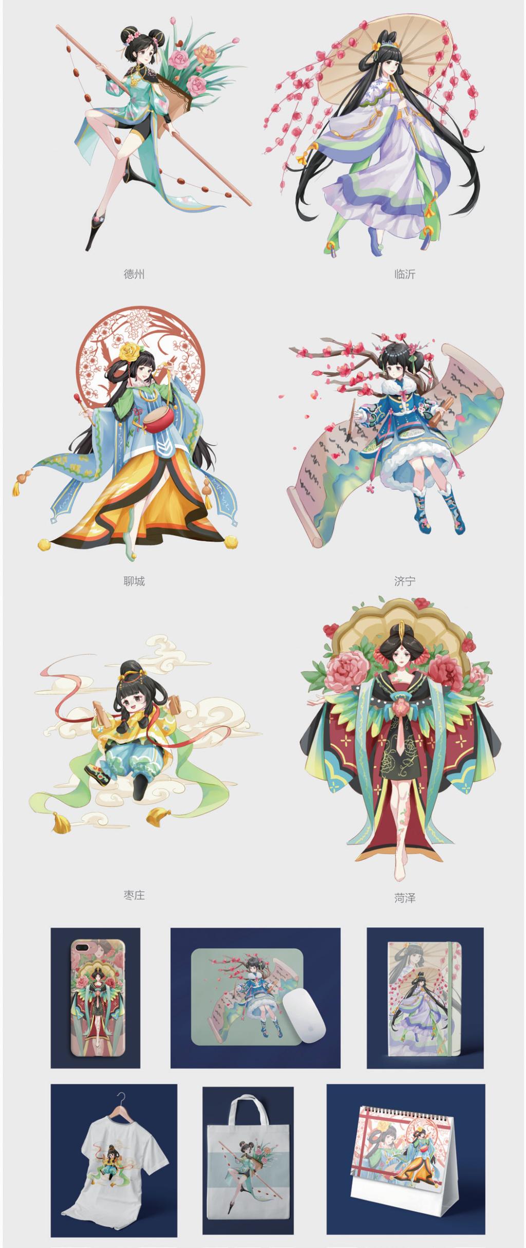 鲁西地区拥有着丰厚的人文历史和极具特色的地域文化,以聊城、德州、济宁、临沂、菏泽、枣庄为代表的六座城市既拥有着共性的文化习俗又呈现出各 自个性化的城市特征,在新旧动能转化与弘扬传统优秀文化的时代背景下,基于其地域性的旅游文化内涵挖掘与现代价值转化有着良好的社会意义与文化价值。根据前期实地调研,以及对成功案例的分析进行创作,通过以人物为主体的模式来创作 IP 形象,设计表现内容主要是“传统民俗”与“现代艺术”的结合与再设计。基于对鲁西六城旅游文化的促进,IP 形象设计从构图、造型、颜色,再到性格、特点等方面紧扣地域特色与时代主题,进行大胆尝试与形象创新,结合现代大众审美需求,探寻鲁西六城 IP 形象设计的经济价值转化,促进地区旅游文化发展同时造福当地经济。