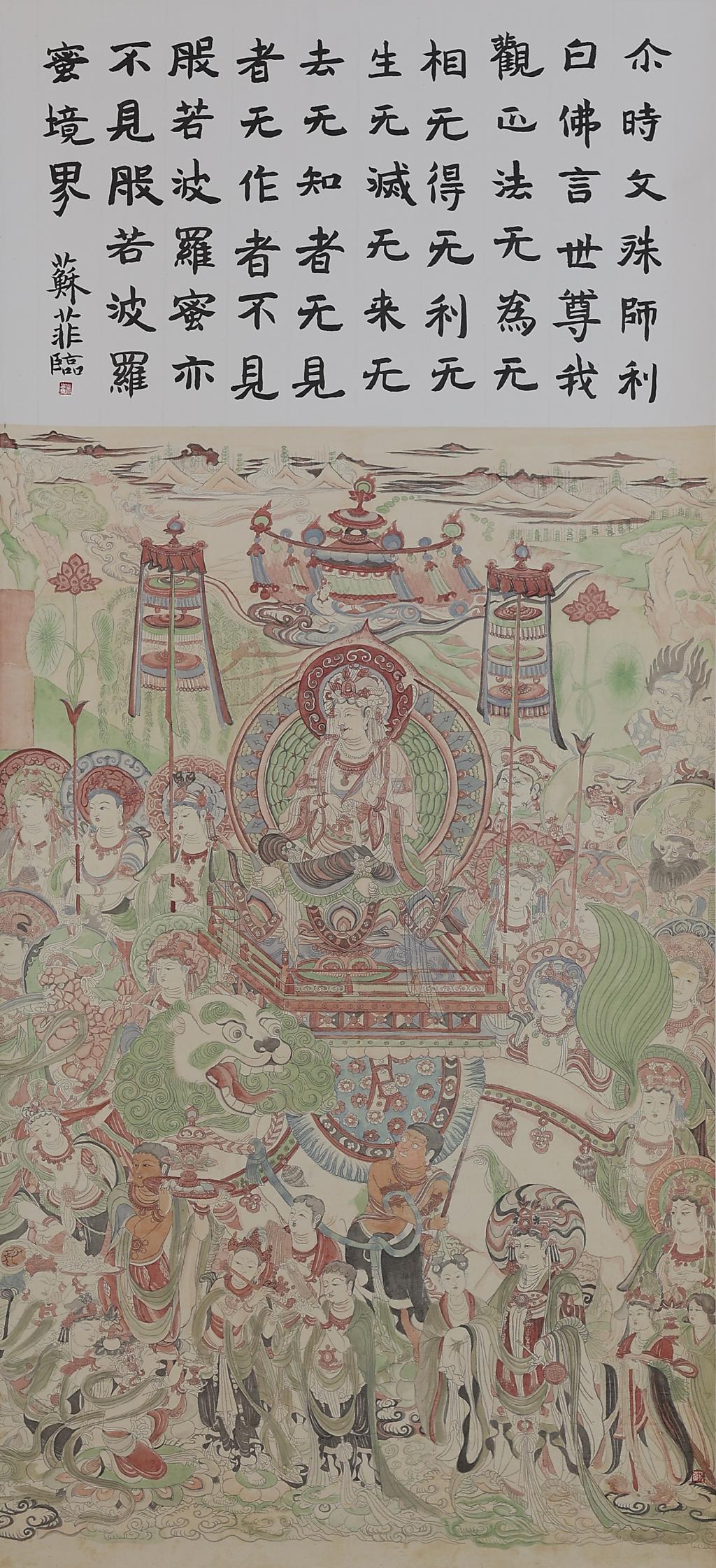 书体为隶楷相间,内容为:“尔时文殊师利白佛言 师尊 我观正法 无为无相 无得无利 无生无灭 无来无去 无知者 无见者 无作者 不见般若波罗蜜 亦不见般若波罗蜜境界 苏菲临。”工笔画为敦煌莫高窟第 159 窟壁画文殊变。