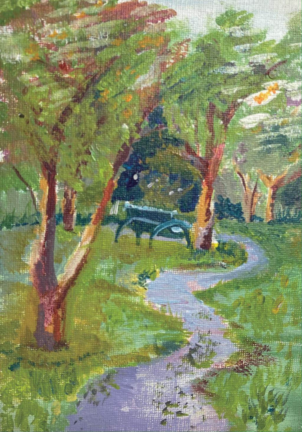 I really wanted to paint from my perspective on the ground. I also really wanted to get the curve of the path with the bench.