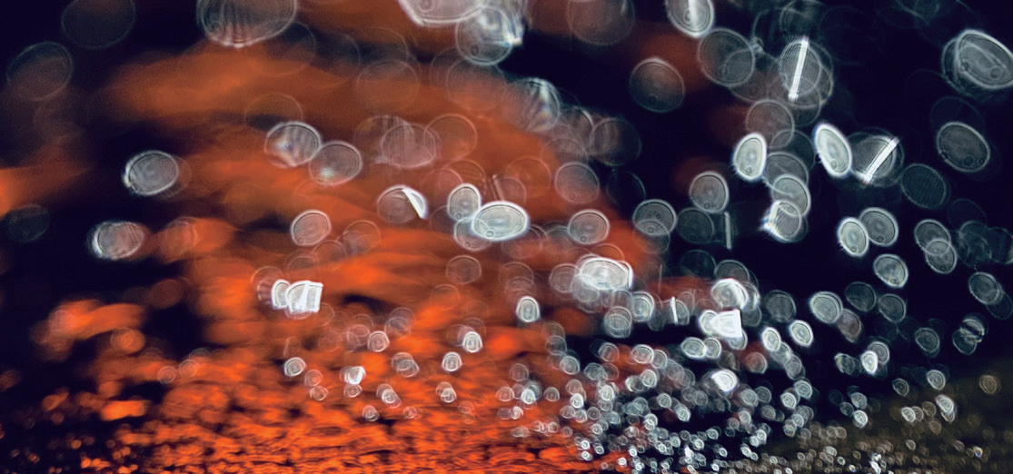 雨夜的街灯和它们投射在湿路面上的光芒激发了我的灵感。当捕捉到这一瞬间时,水与光混合形成了细胞状的结构。水和光的自然元素抽象地揭示了自然界的生物学意义。