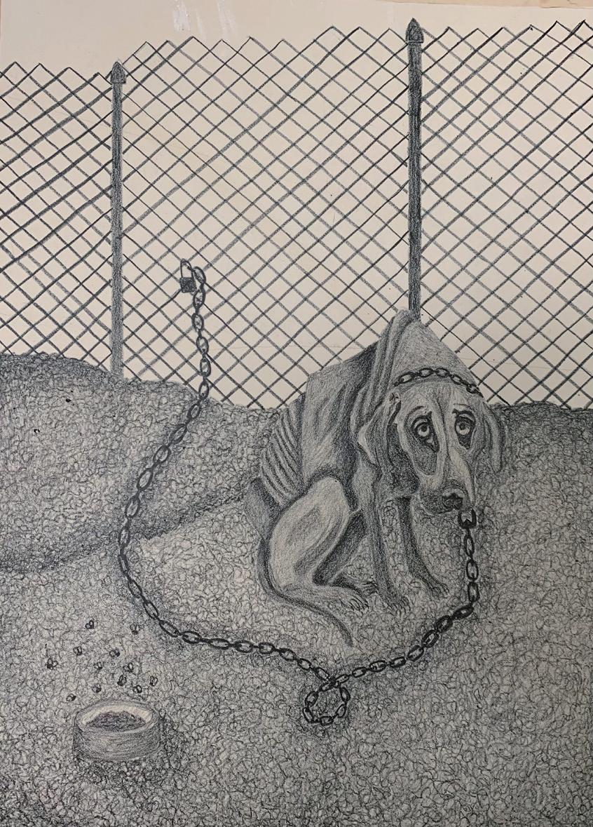 My Thesis revolves around how humans are impacting the lives of innocent animals negatively in the world. This includes abuse, global warming issues, deforestation, how animals are treated in meat factories, and so on. I expose the selfishness of the human race when it comes to the lives of animals within my work. Humans will always put themselves first without a thought of how it will impact other innocent lives around them. In this specific piece, I am showing how some people treat animals they own by starvation, neglect, and abuse.