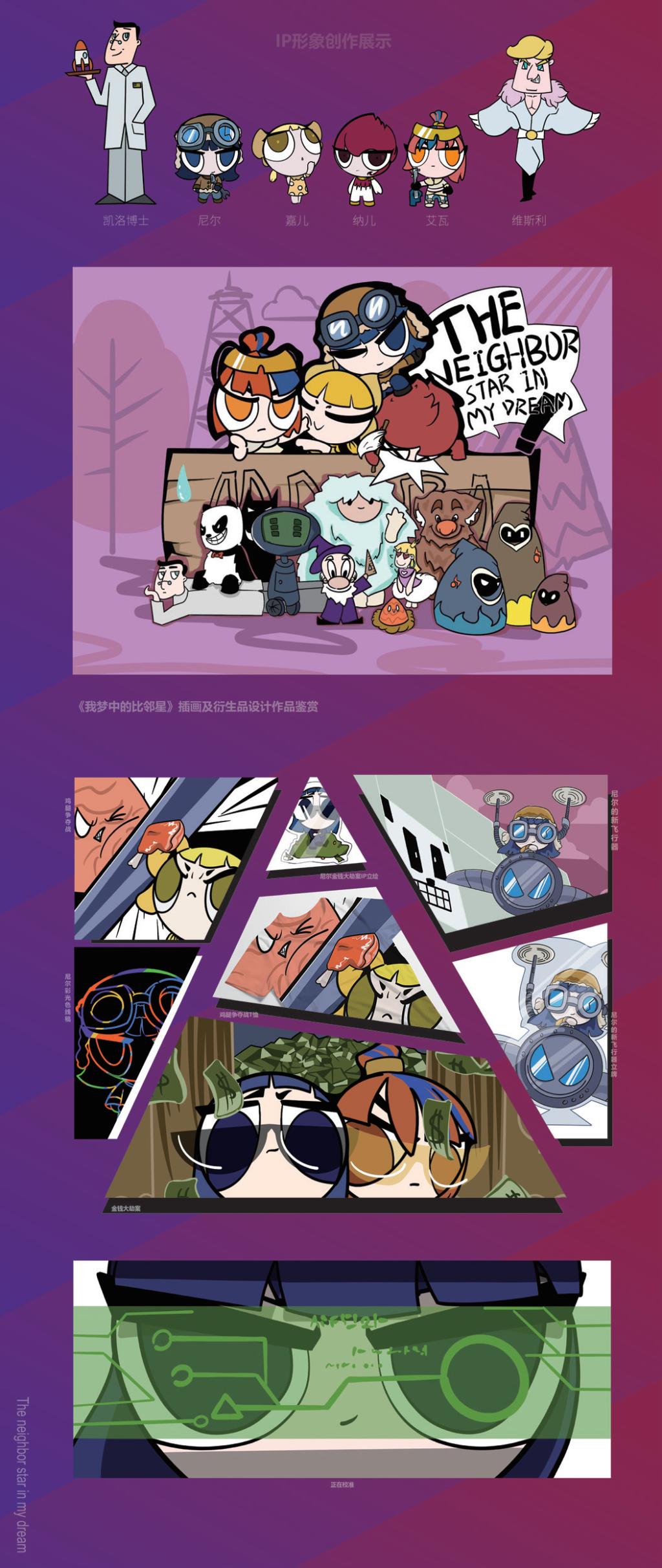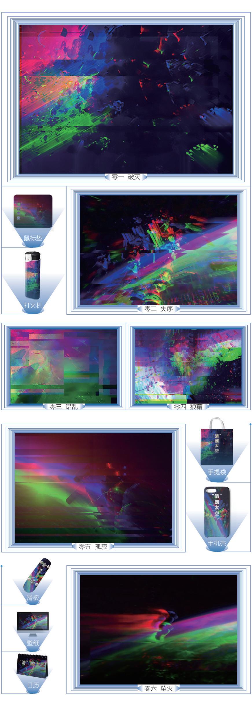 《“清”朗太空》系列插画描述的内容为太空垃圾的状态。通过对比强烈色彩的碰撞、表现速度的线条等。以赛博朋克的艺术风格来表现太空垃圾。太空垃圾还有破碎,杂乱等特点。所以还结合了抽象和故障艺术的手法来处理画面。色彩以红蓝绿三色为主,将它们进行重合叠加错位使画面呈现一种凌乱而有序的矛盾美。《“清”朗太空》系列插画创作的目的是希望人们多一些对太空环境的关注与了解。