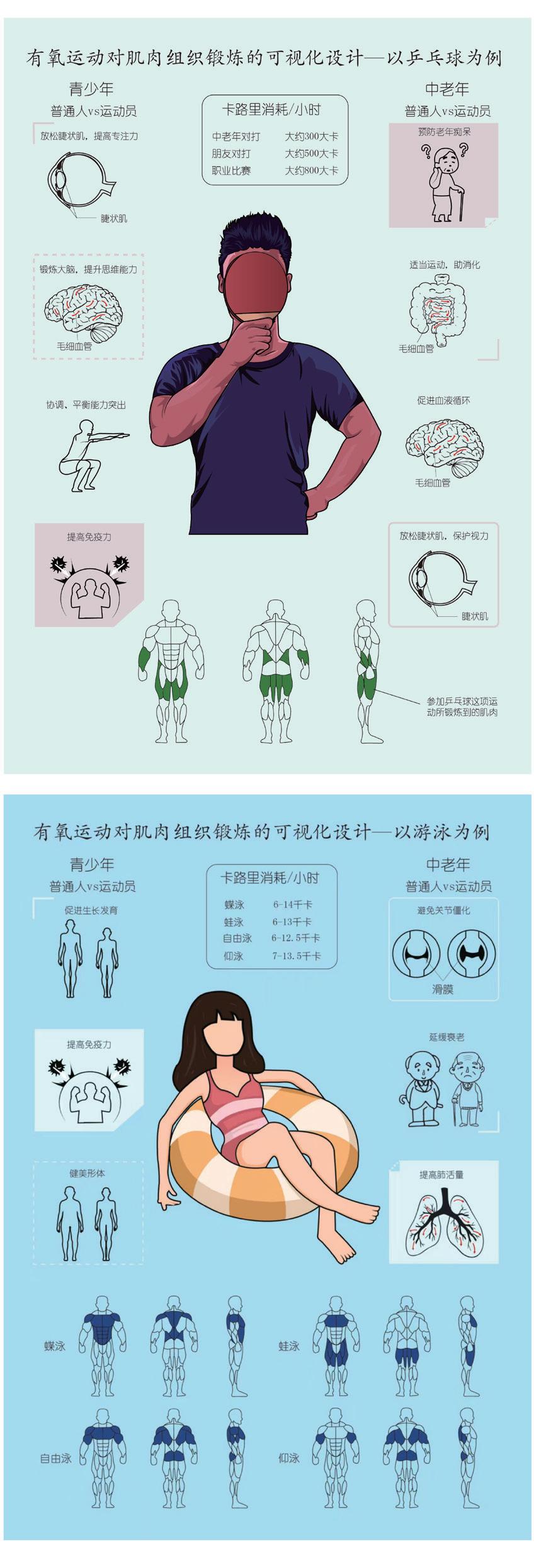 作品名称:有氧运动对肌肉组织锻炼的可视化设计 - 以乒乓球,游泳为例 | Visual Design Of Aerobic Exercise To Muscle Tissue Exercise—Taking Table Tennis And Swimming As Examples