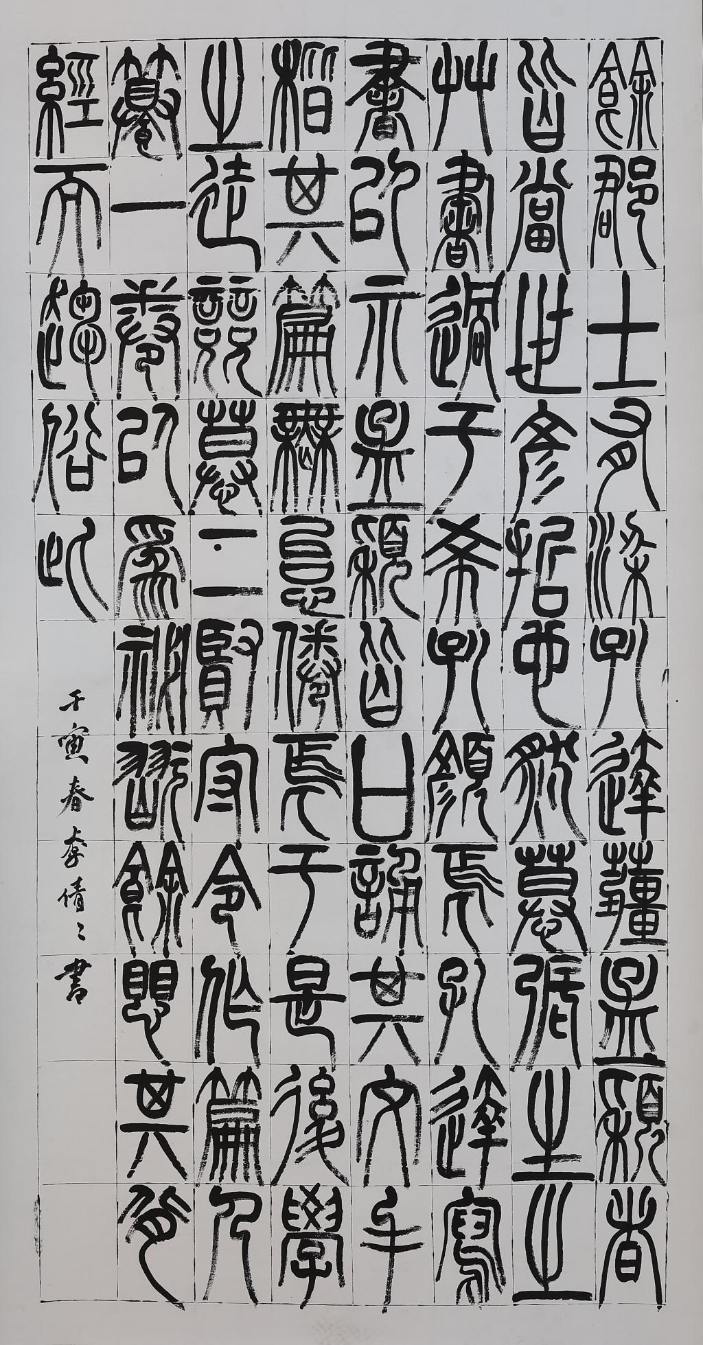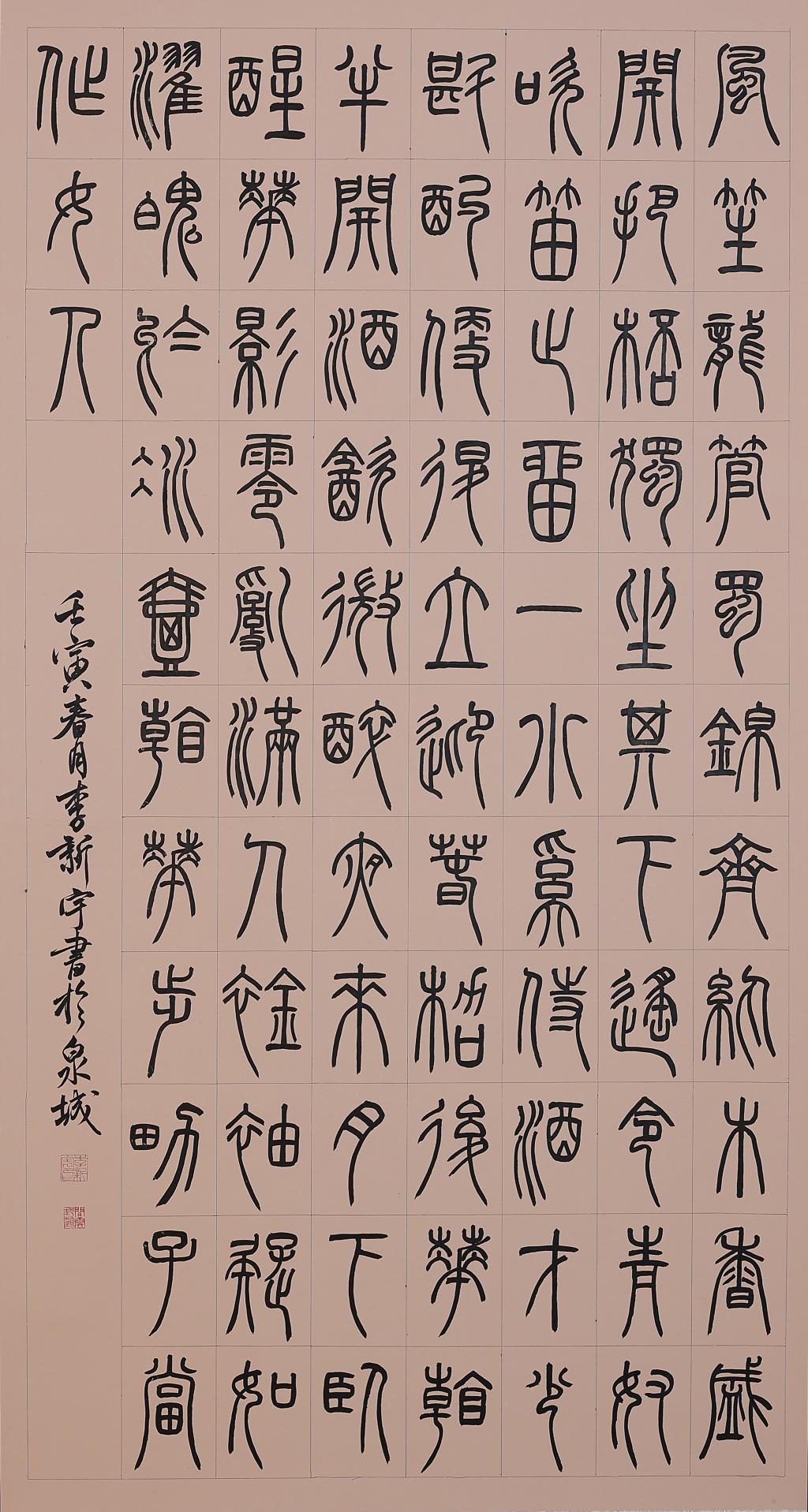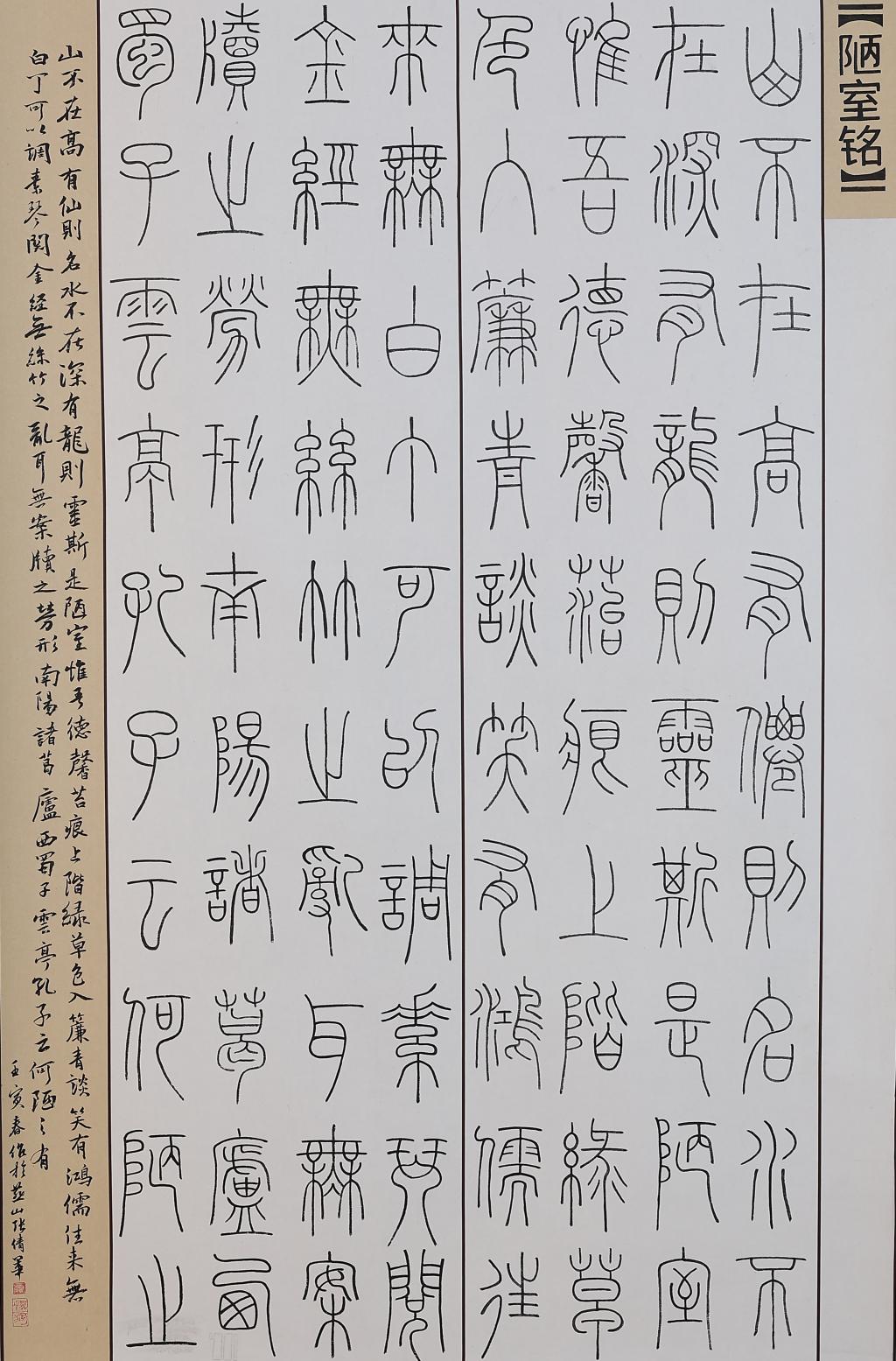 小篆书 《陋室铭》释文:山不在高,有仙则名:水不在深,有龙则灵。斯是陋室,唯吾德馨。苔痕上阶绿,草色入帘青。谈笑有鸿儒,往来无白丁。可以调素琴,阅金经。无丝竹之乱耳,无案牍之劳形。南阳诸葛庐,西蜀子云亭。孔子云:“何陋之有? ”