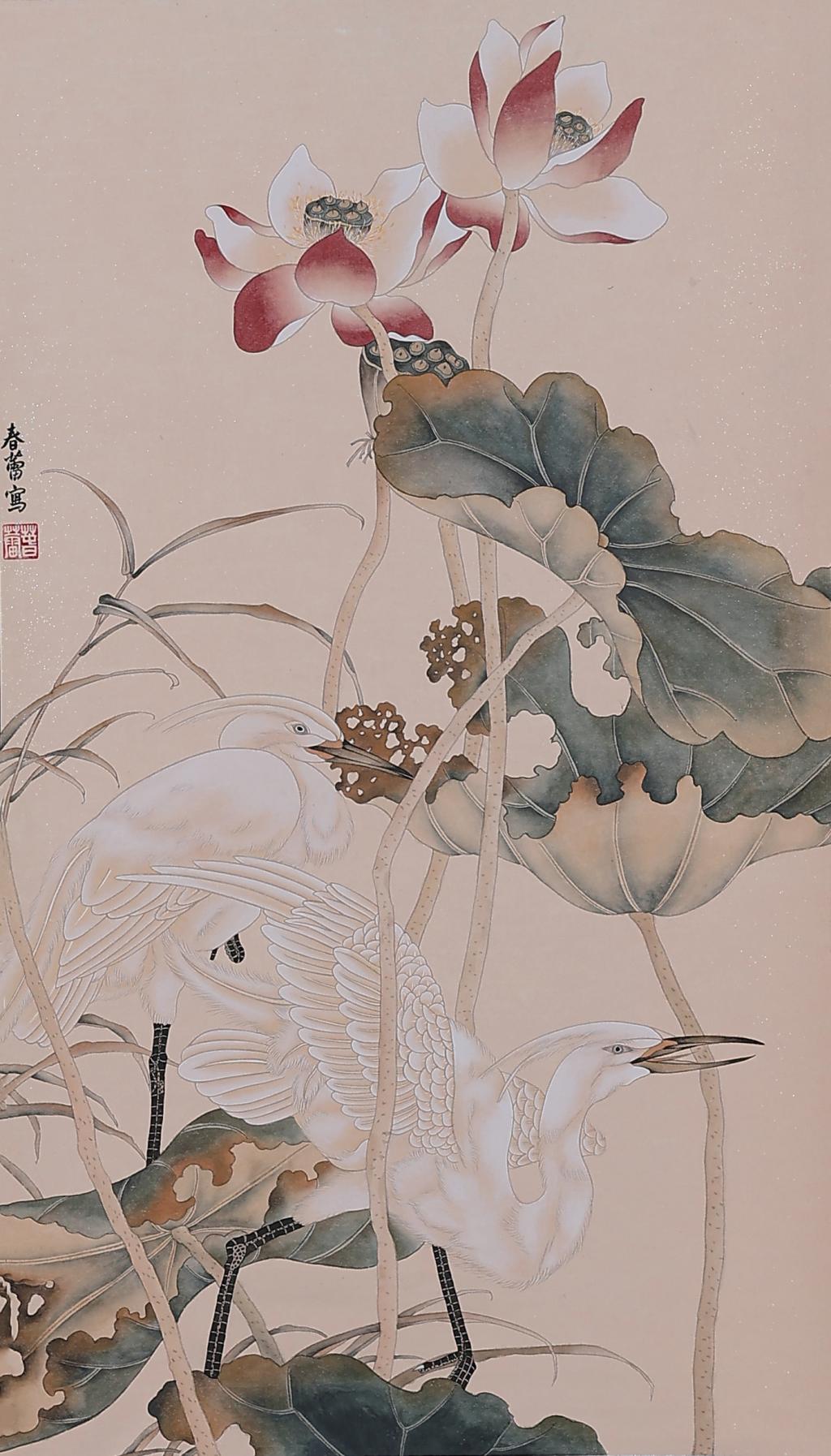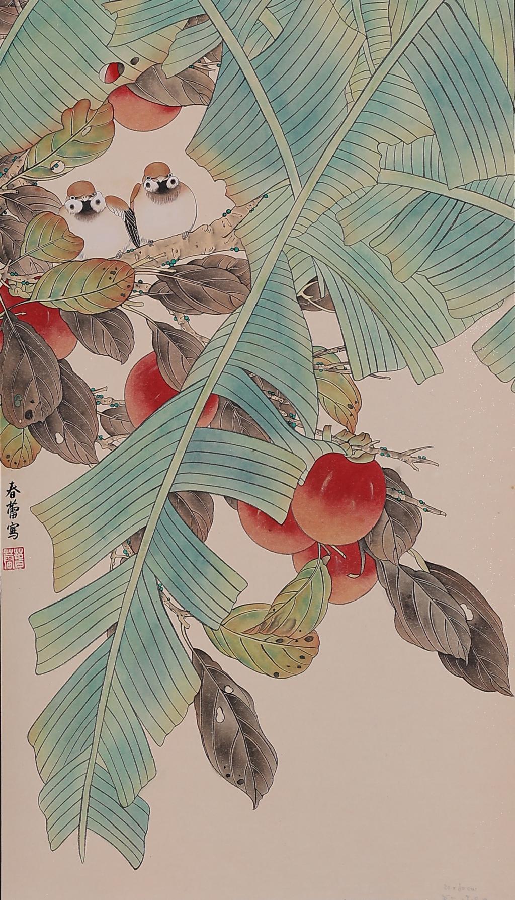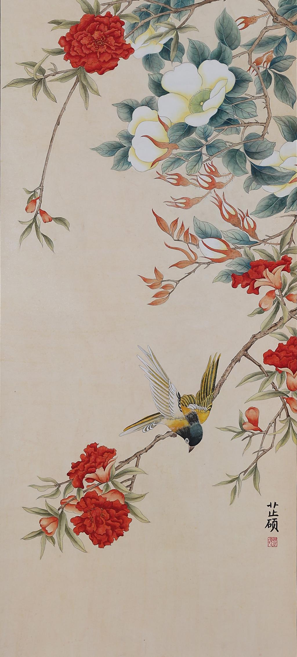Flowers and birds are the traditional theme of Chinese painting, which I use for creation, blending flowers and birds into the picture harmoniously. In terms of color matching, I also choose the traditional cinnabar, garcinia and three greens, making the picture simple, natural and serene.