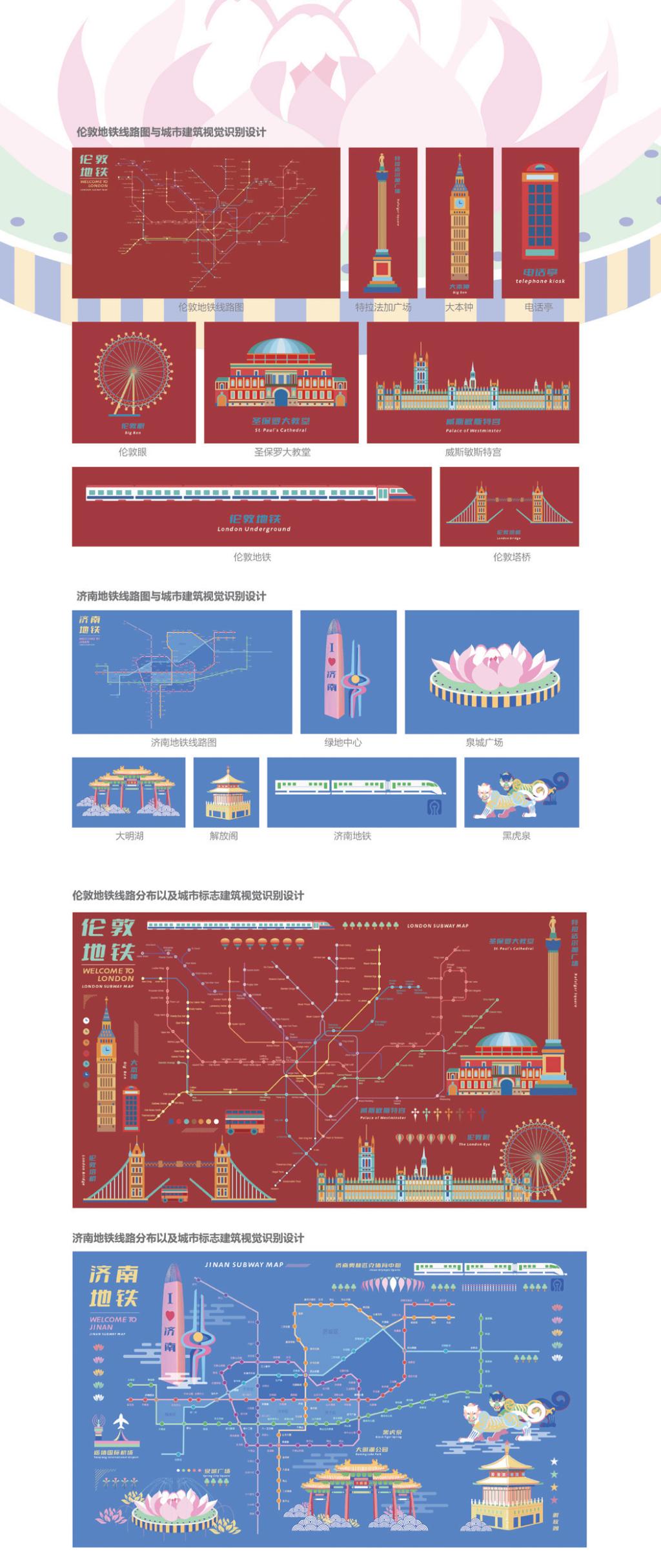 The dynamic visual identification design uses a dynamic approach to represent the subway, one of the most popular modes of transportation in the contemporary world, and studies the line design, culture and art forms of the subway in Jinan and London. It also shows the development of subway lines in the two cities and combines the author's understanding of the architectural art in the two cities. The author mainly uses flat illustration style to design and draw the subway and urban elements from Jinan to London, and uses rich color expression to form a strong visual impact effect, and finally presents them in a more interesting animation way