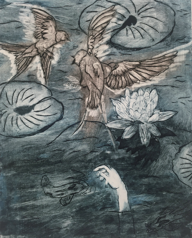 在创作这幅作品之前,我从没有在我的作品中探索水的出现。我想用一片水域作为鸟儿们搏斗的场景。我喜欢伸出的手和搏斗的鸟与水、鱼和睡莲创造的平静气氛形成的强烈反差。