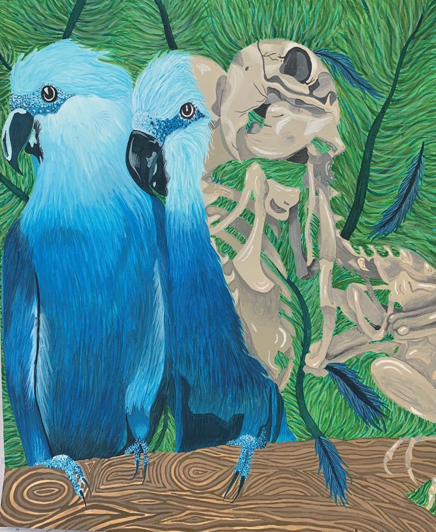 我的研究围绕人类如何对世界上无辜动物的生活产生负面影响展开。这包括虐待、全球变暖问题、森林砍伐、肉类工厂如何对待动物等等。在我的作品中,当涉及到动物的生活时,暴露了人类的自私。人类总是把自己放在第一位,而没有考虑到这将如何影响周围其他无辜的生命。蓝金刚鹦鹉是一种美丽的热带鸟类,不幸的是现在已经灭绝。如果我们继续以这样的方式对待野生动物,我们将继续失去像这样美丽和无辜的动物。