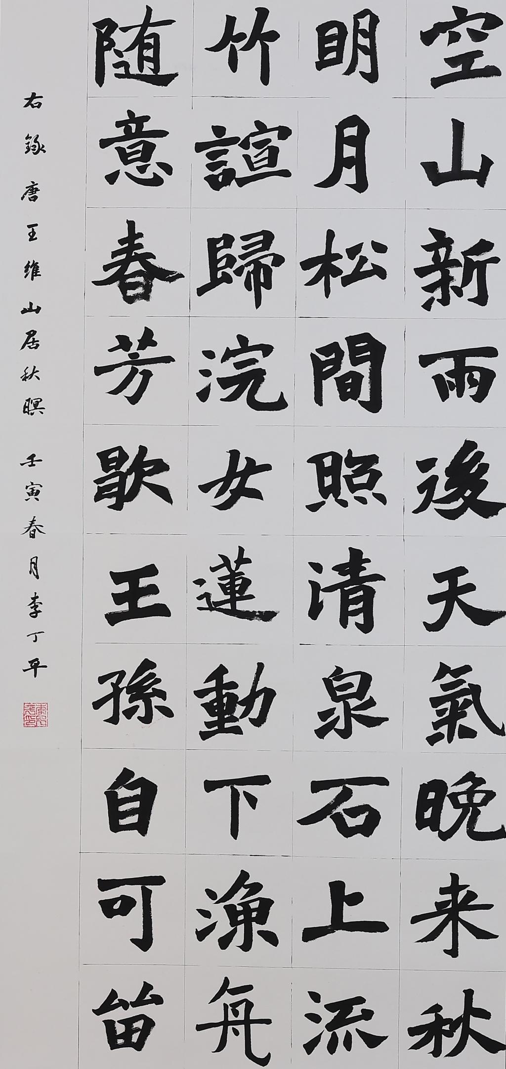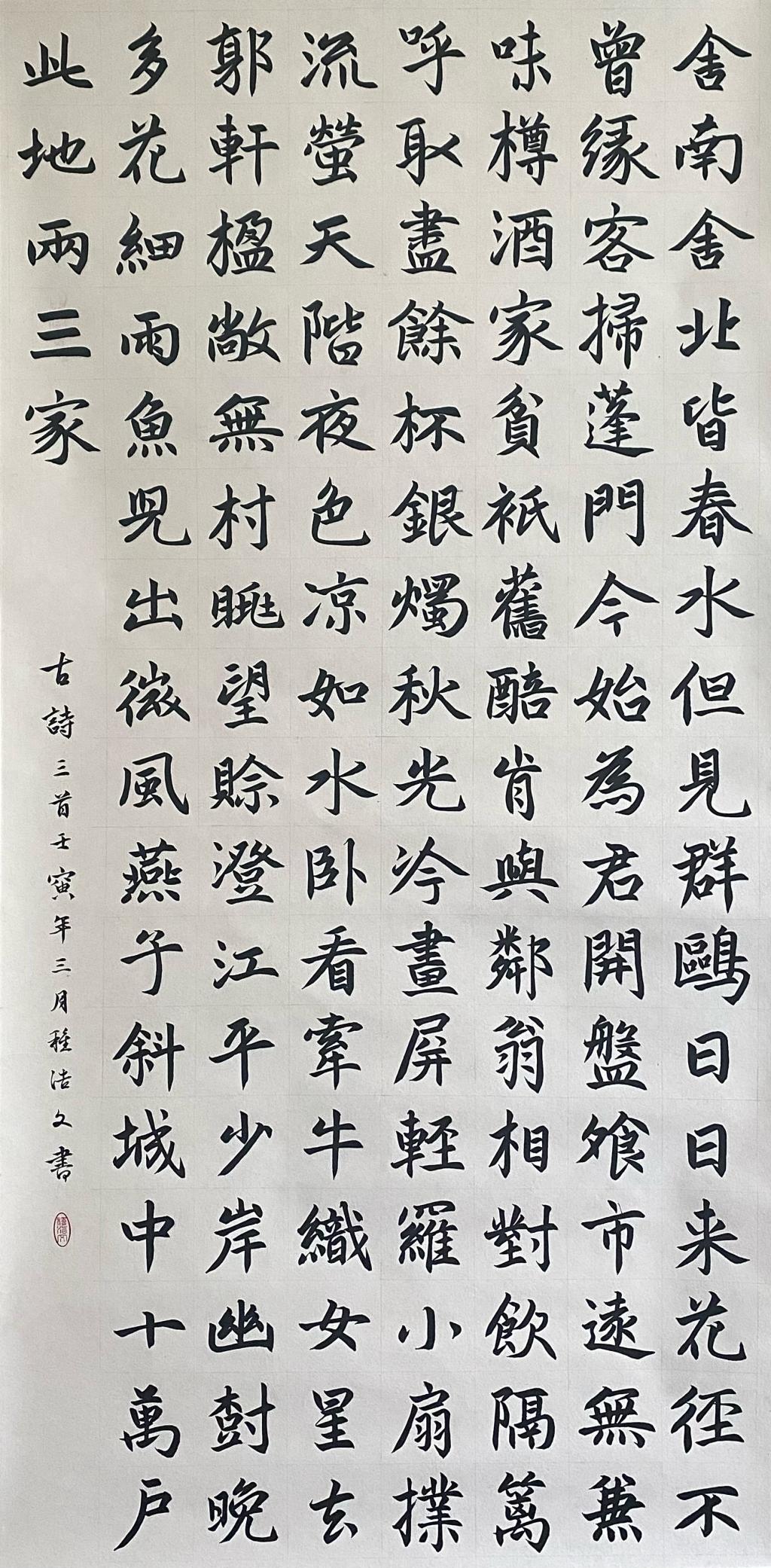 The calligraphy is regular script. The contents are, in order, "Guest Arrival" by the Tang Dynasty realist poet Du Fu, "Autumn Evening" by the outstanding Tang Dynasty poet Du Mu, and Du Fu's poem " Relaxation at the Water Threshold (Part 1)".