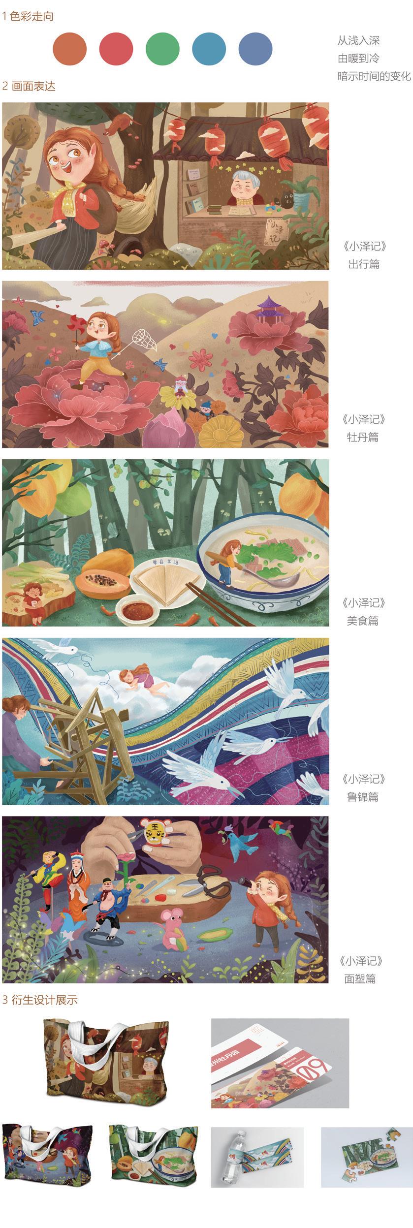 采用儿童插画形式展开系列性视觉设计研究,通过对菏泽地域文化进行深入的分析挖掘,并紧密围绕“儿童插画”与“传统文化”两大板块进行设计,通过对儿童插画国内外发展现状和菏泽地域文化分析,在造型色彩上进行设计,绘画出这一组名为“小泽记”的儿童插画,并对该组儿童插画进行衍生设计研究,以达到拉近儿童与地域文化的联系进而增强文化自信的目的。