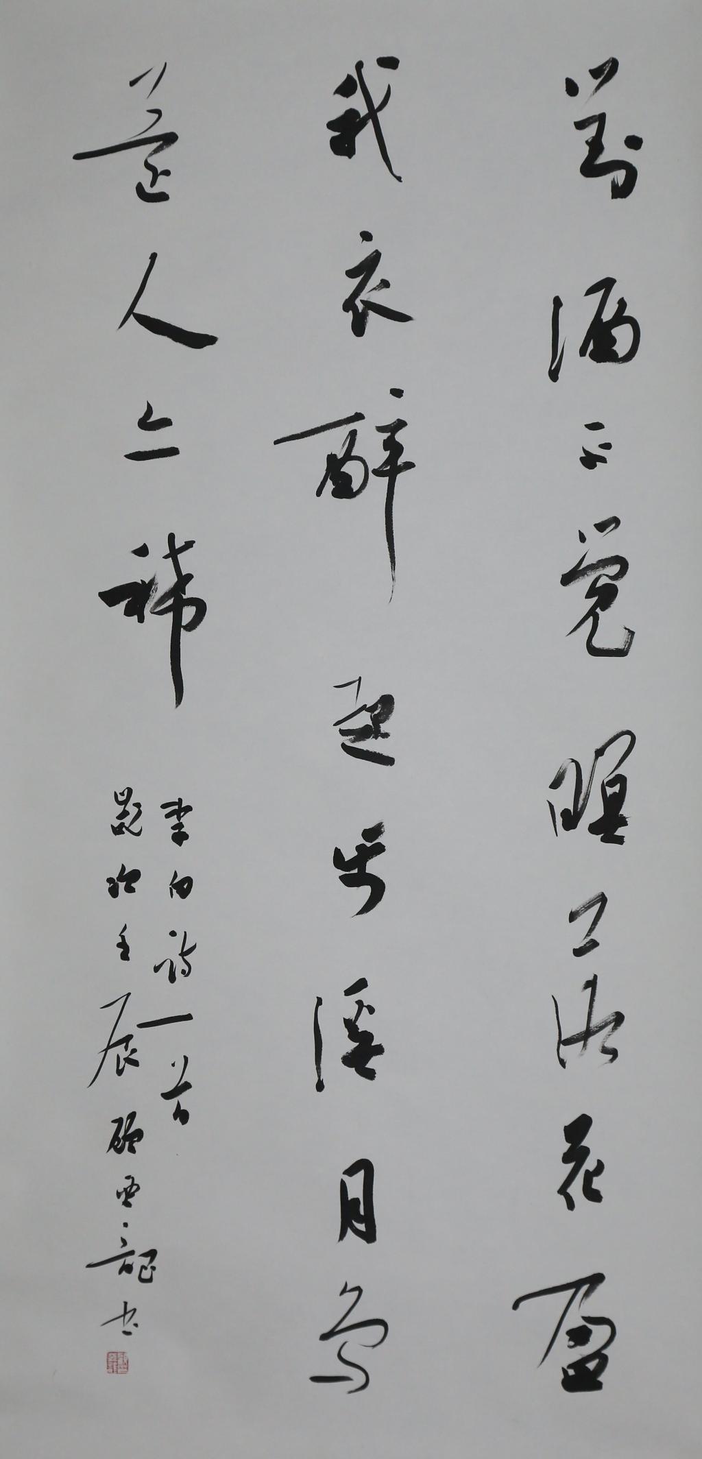 释文:对酒不觉暝,落花盈我衣。醉起步溪月,鸟还人亦稀。