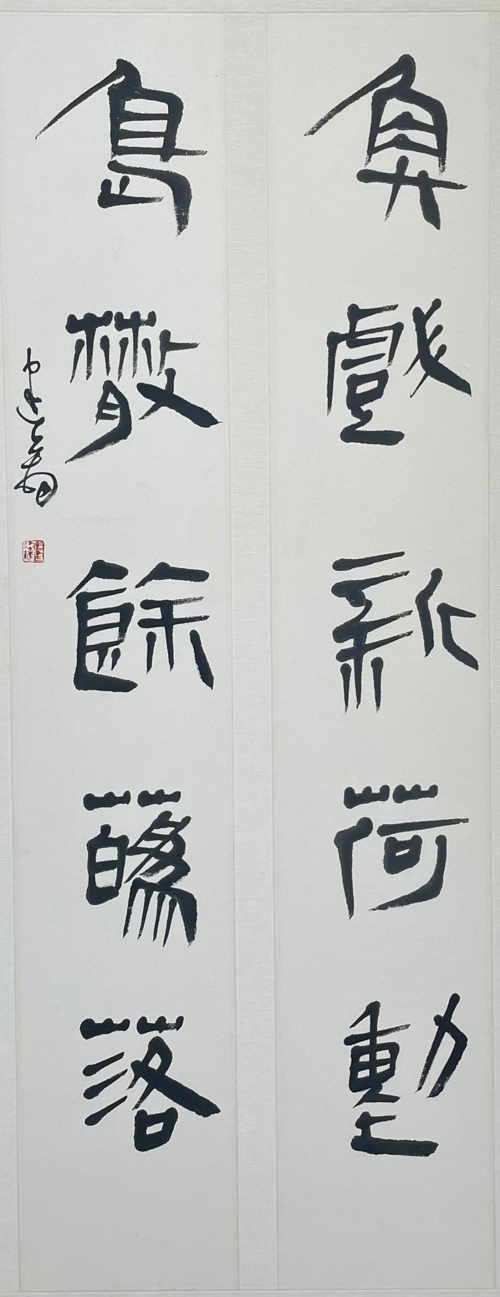 篆书 鱼戏鸟散联